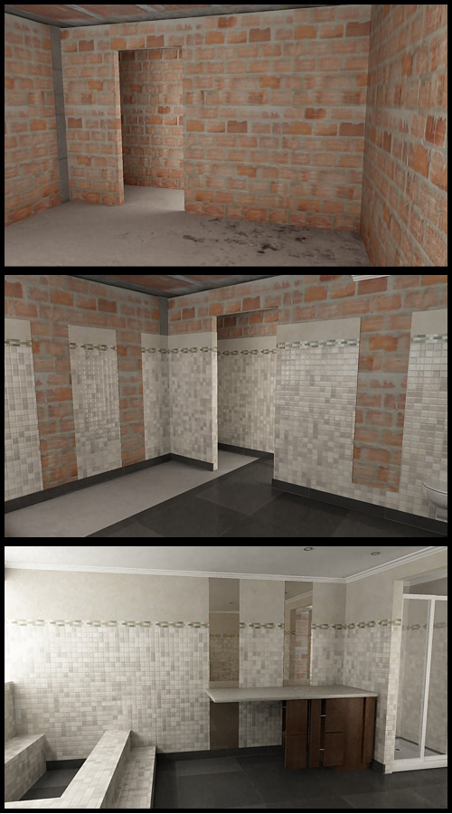 Una vez terminado el baño acabado valga la redundancia, me copié los muros, el suelo y techo dejándolos por detrás y dando un material de obra (cemento, rasillas, bovedillas). Luego apliqué un modificador slice al suelo, muros y techo final. También a otros objetos. Los sanitarios y el mueble del lavabo aparecen con un simple cambio de escala y movimiento que fui aplicando regresivamente, es decir, modificando los objetos y marcando los keyframes al revés, de adelante a atrás.