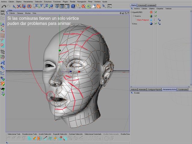 Ante todo, bienvenido. No es frecuente ver usuarios que usen Cinema 4d o LightWave por aquí, así que, doblemente bienvenido la forma de la cabeza, así a bote pronto, lo único que me incómoda un poco es la frente, que creo debería de ser un pelillo más vertical, o incluso hacerle la caja craneal un poco más grande, porque parece que tú modelo tiene mucha cara. Igual es la perspectiva, o igual son los cubatas que me he tomado en el curro, pero me da esa sensación, sobre el wire, debajo te adjunto una imagen corrigiendo algunas cosas. Los vértices de los modelos es mejor tenerlos más ordenados, sobre todo de cara a la animación, correspondiendo las aristas de los polígonos a las líneas de los músculos que recorren la cara. En rojo, lo que yo corregiría, y ya que usas Cinema 4d, ¿nos podrías comentar un poco las virtudes de este programa? Saludos.