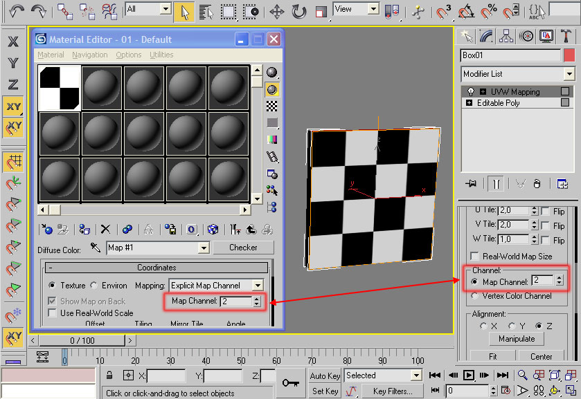 Recuerda como te ha dicho Halfvector que tienes que indicarlo en dos sitios distintos : uno en el modificador UVW mapping y el otro en su correspondiente casilla del editor de materiales. Saludos.