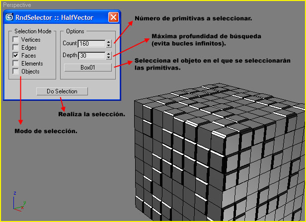 El parámetro que tal vez puede sonar raro es el depth. Esto indica la profundidad máxima de búsqueda para evitar entrar en un bucle infinito. Si, por ejemplo, pones que se seleccionen 200 caras, pero el contador de 3ds Max te dice que sólo se han seleccionado 190, aumenta el depth hasta que se seleccionen las 200.