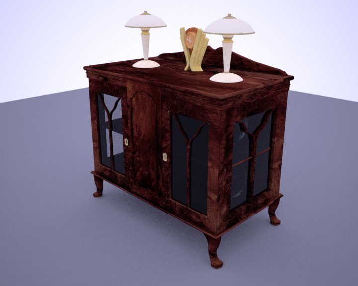 Venga tíos, que seguro que es por falta de periciamía, no del motor, la misma escena en Mental Ray, con FG 100 y con un HDRI como iluminación me ha tardado 47 minutos, y solo del armario, sin lámparas ni el reloj (art deco, creo que cambiaré un poco el tono, pero en verdad es amarillo) espero hacer una escena completa en breve, seguiré postehando aquí los objetos y el tiempo, espero que vayan bajando a medida que me hago con los controles de la v1 y no te contengas Mikimoto ríete leches que es sano.