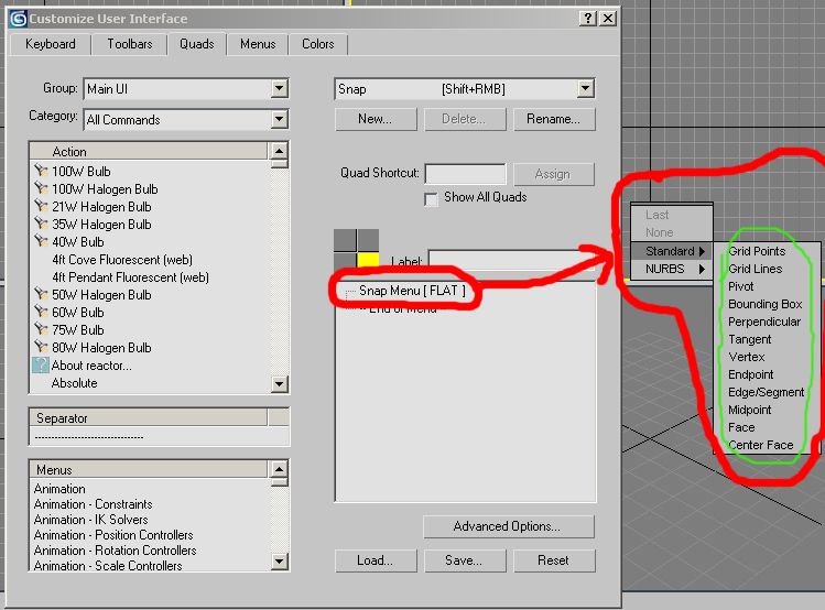 En 3dsMax 8 estoy intentando configurar el menú contextual que aparece al pulsar simultáneamente el botón derecho del ratón + shift de manera que, sólo salga las opciones que remarco en verde en la imagen. Lo que está rodeado en rojo es lo que he conseguido.