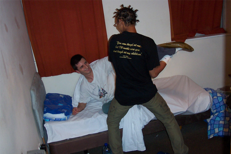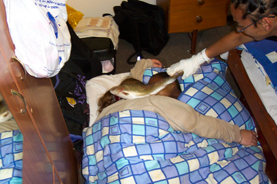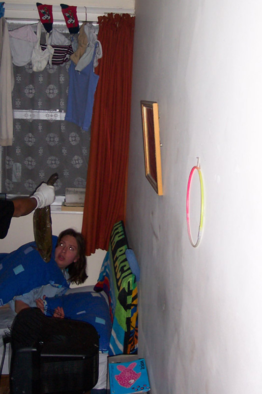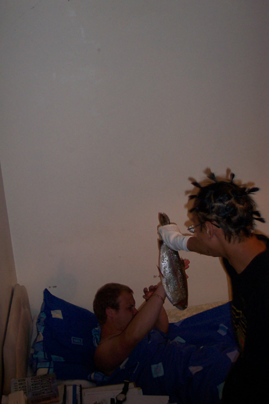 Llegamos al recinto de monitores a la 1 de la madrugada, casi todos estaban durmiendo, uno de los copañeros se fue a duchar y mientras el otro, Andy, y yo pensamos una trastada: entrar en silencio en las habitaciones de los que dormían y ponerles el pescado en la cara (eso Andy) yo hacía las fotografías del momento, (más abajo las veréis.)