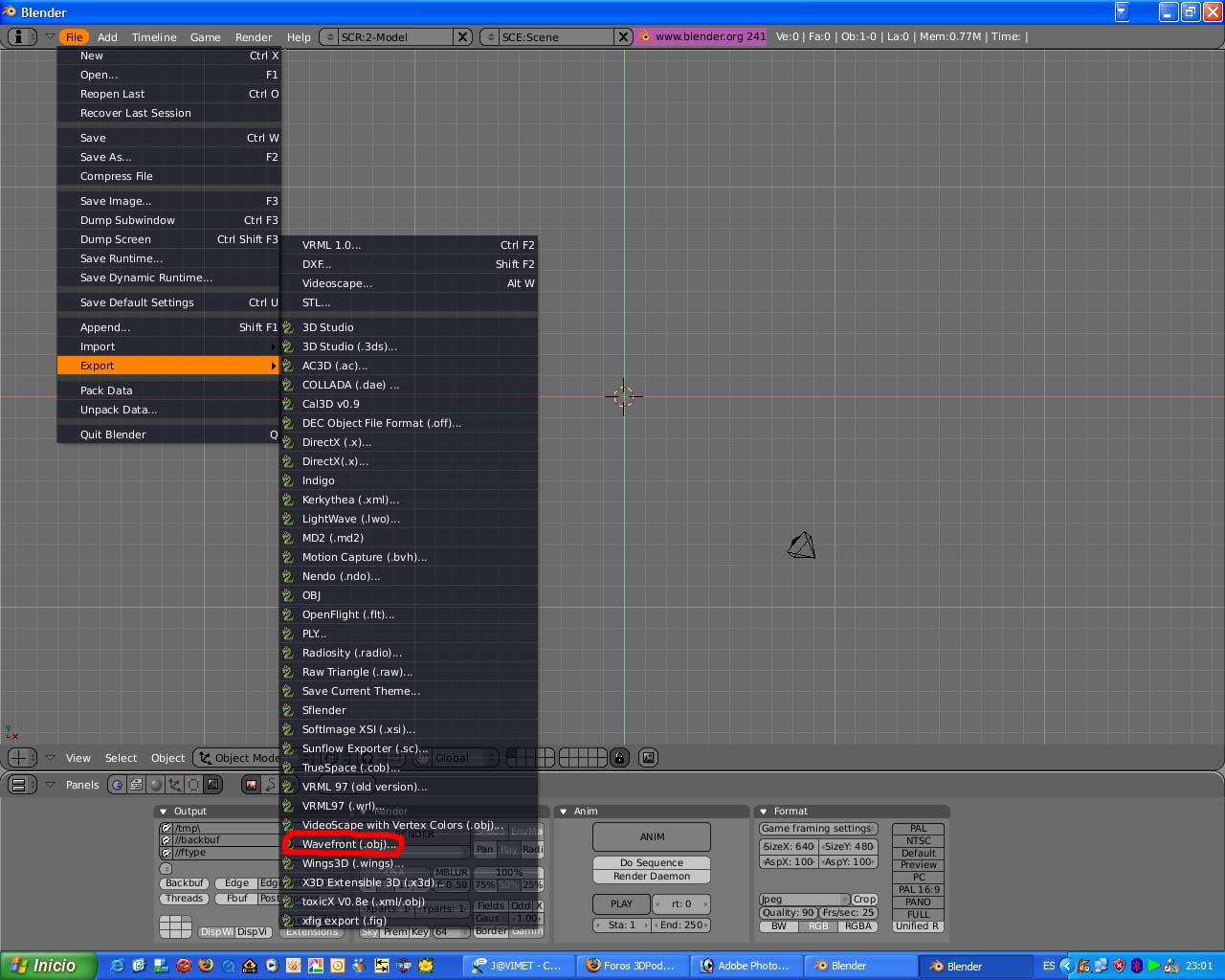 Hola me he bajado la versión 2.41, es mi primera experiencia con Blender he visto el manual en castellano de http://mediawiki.blender.org/index.p...es/manual, que por cierto está muy bien. Pero no encuentro como exportar e importar.obj, realmente no sé si se puede? Mi intención es tratar de relacionar hexágono y Blender.