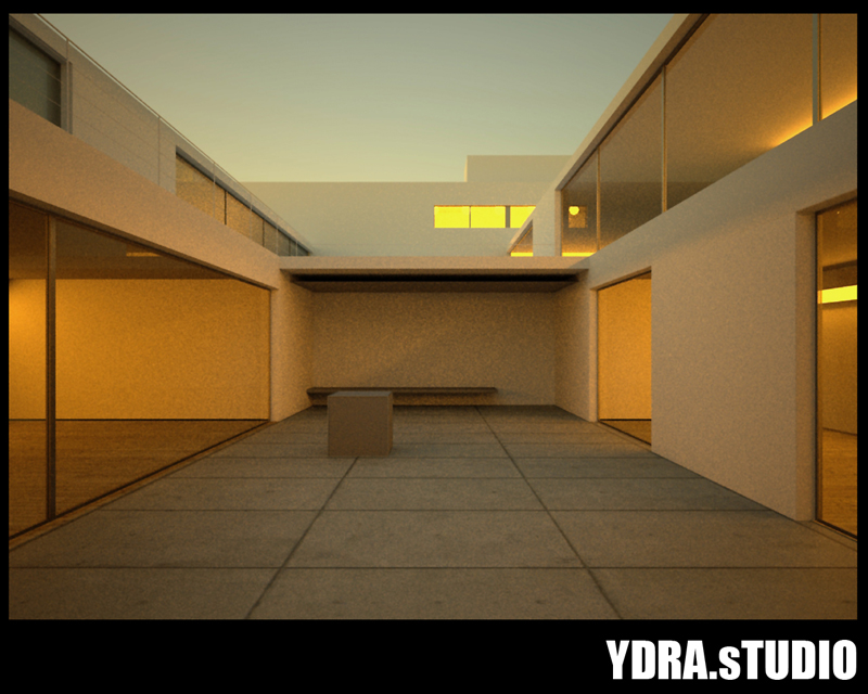 Hola. Basándome en un tresde que vi en el foro de Maxwell he creado este patio para una galería de arte que estoy proyectando.