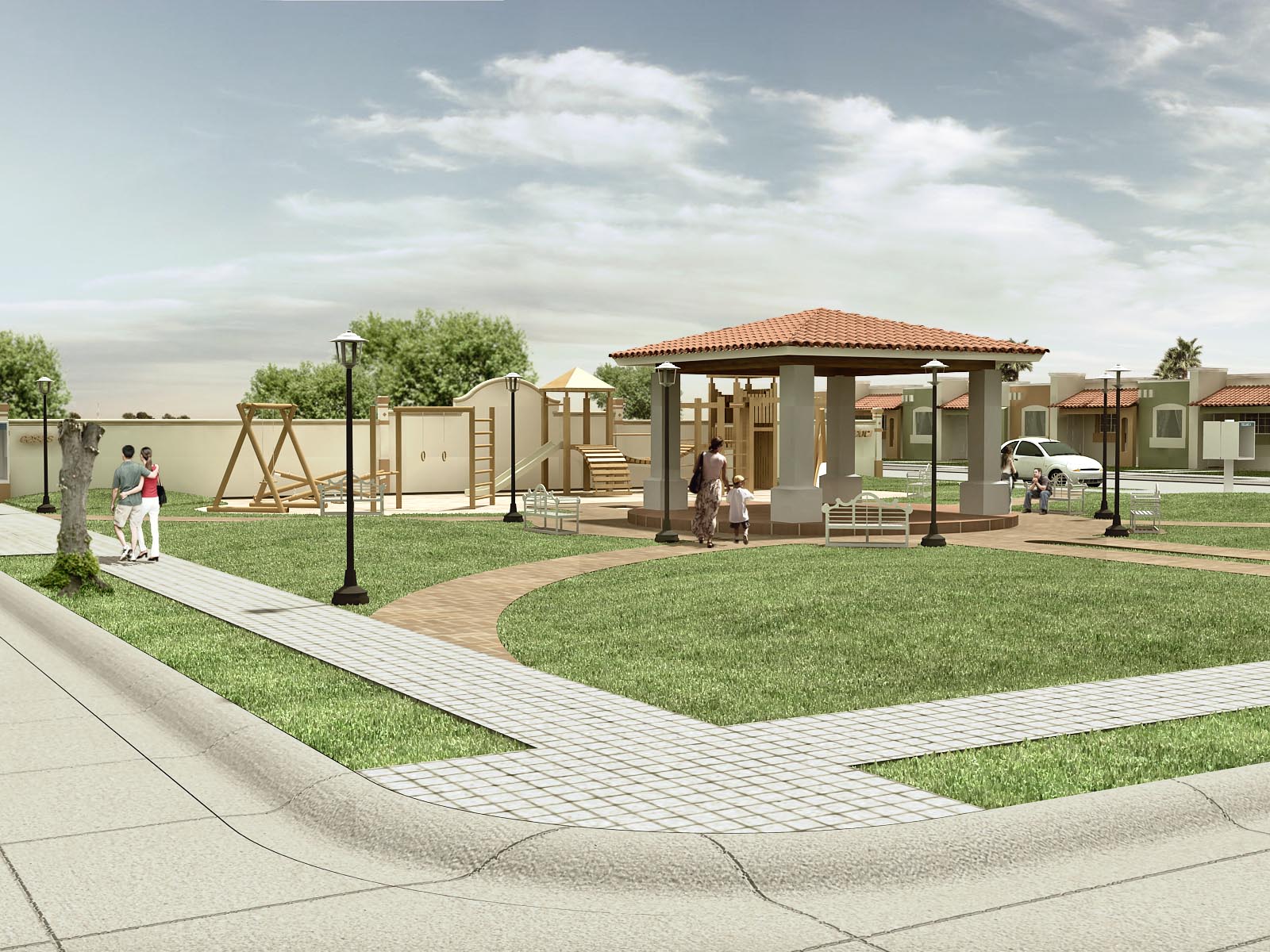 Lo de las baldosas pensé en poner algo de concreto estampado con esa textura, pero si efectivamente el cliente me sugirió que lo cambiara.