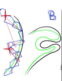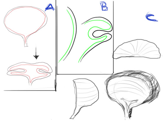 Hola gente, pues para los que lo sabéis, yo sigo con mi vejiga, para los que no lo sabéis estoy haciendo una vejiga urinaria. Ya la tenía riggeada para que se deformara, pero ahora el médico me ha hecho cambiar el setup porque tiene que deformarse como adjunto en el dibujo (a) es decir, las paredes tienen que plegarse de arriba a abajo y a un determinado ángulo, han de meterse hacia adentro. El problema es que tengo dos objetos (el negro y el verde, en el esquema (b)) que han de deformarse exactamente igual, una es la capa muscular y la otra la capa mucosa, vamos. La forma de la vejiga seccionada es, Grosso modo, como aparece en el esquema (c). Si no fuera porque tengo dos objetos distintos, hubiera hecho un Morph y a tirar, pero como ambos han de deformarse a la par, sólo se me ocurre hacerlo con Bones y aplicarle los mismos Bones a ambos objetos. El problema es que, al hacer el pliegue hacia adentro, la malla se entrecruza y no sé cómo hacer para modificar esa doblez que afecte a los dos objetos por igual, porque si uso un gizmo de angle deformer no me saldría igual para los dos objetos.