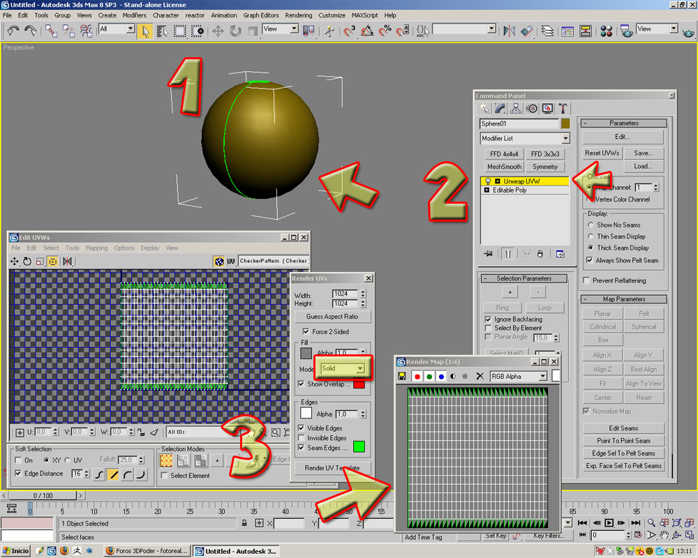 Empecemos haciendo una esfera (1), a dicha esfera le pondremos solamente un modificador de Unwrap (2) para sacar las UVS (recomiendo que se empollen el Unwrap ya que, con los Pelt y la cantidad de herramientas que tiene, es todo un lujo). Una vez hayamos desplegado la malla (esta es automática en este caso) se comprueba que no haya ningún polígono solapado, ¿cómo? Con el render UVS que trae el editor del Unwrap de 3ds Max eligan las mismas opciones y pongan solid que es para este fin (3).