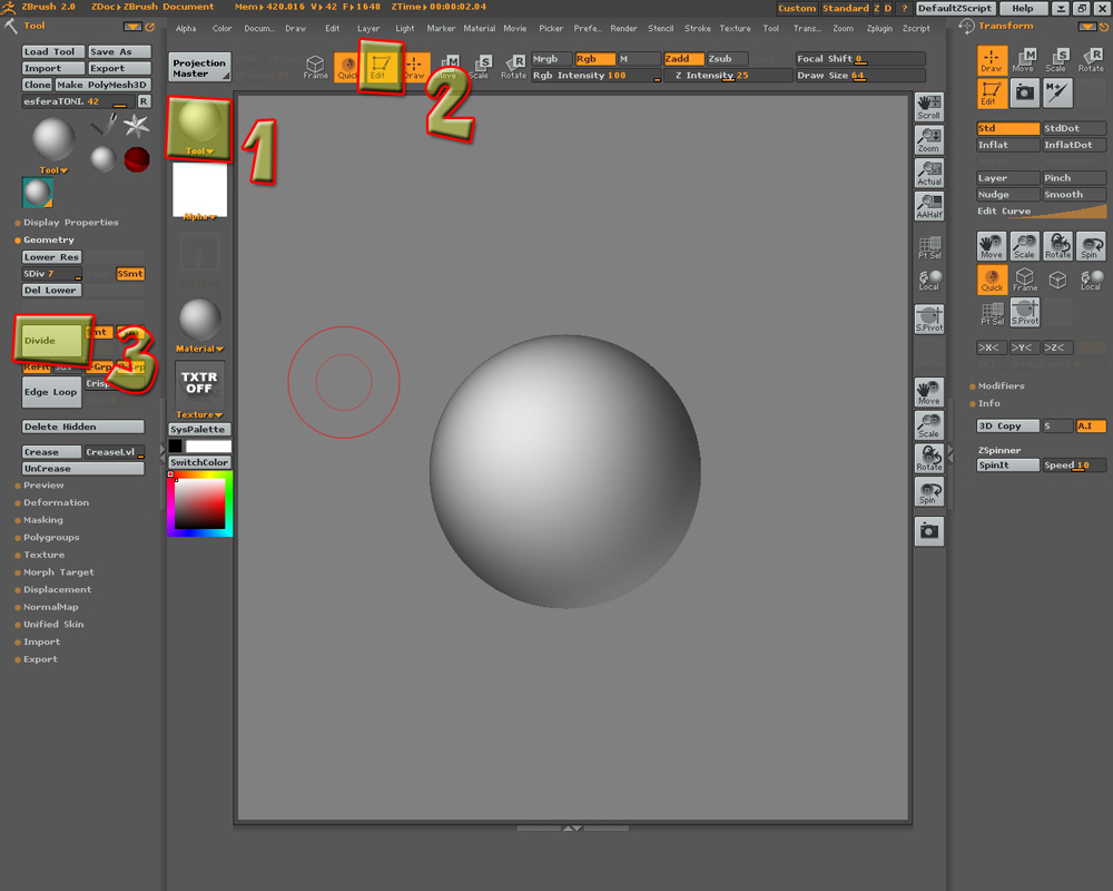Ya estamos en ZBrush y ahora vamos hacer lo básico, que es importar la malla que hemos creado en 3dsmax y esto se hace desde la ventana tools (1) y buscaremos la opción importar (hay más formas, pero esta es para mí la más rápida), picamos y arrastramos y aparece la malla en cuestión, luego, para poder editarla y hacer cualquier cosa con ella le damos al botón edit (2), con esto ya podemos pintar y modificar la malla, y ahora aplicaremos un suavizado (3) yo siempre pongo el máximo que me deje la máquina (hay que recordar que mientras mejor repartido estén los polígonos en una malla simple, mejor se distribuiran las subdivisiones en ZBrush, pero de esto hablaremos otro día.