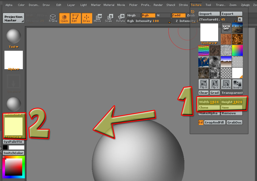 Ahora creamos una textura nueva, en texture, new texture, fiajos que cuando le deis al new (1) en la parte de la izquierda de texture (2) aparece una imagen blanca, esta imagen blanca es la que hemos creado nueva.