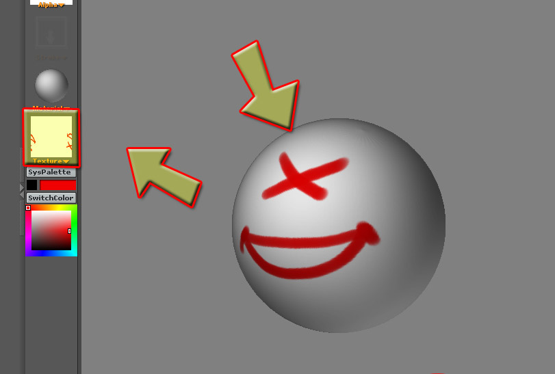 Vamos a proyections master (pm) y hacemos lo que queramos con el pincel básico, una vez terminado (y recordando que el ZBrush no te deja trabajar el color en tiempo real, ya veremos más adelante el por qué) le damos otra vez a proyection master (la g es el atajo de teclado) y a enter.