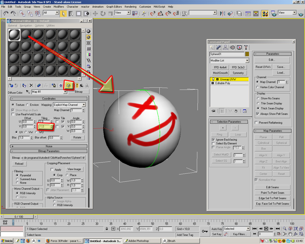 Gracias -YeraY- Otra vez por la solución. Seguí los pasos como explicaste, con la esfera y todo salió correctamente. Ya me estaba frotando las manos, ahora me quedaba aprender a usar el Unwrap y ya podría texturizar con ZBrush, pero, tengo que ser un negado para esto del tresde porque lo difícil lo complico la ostia.