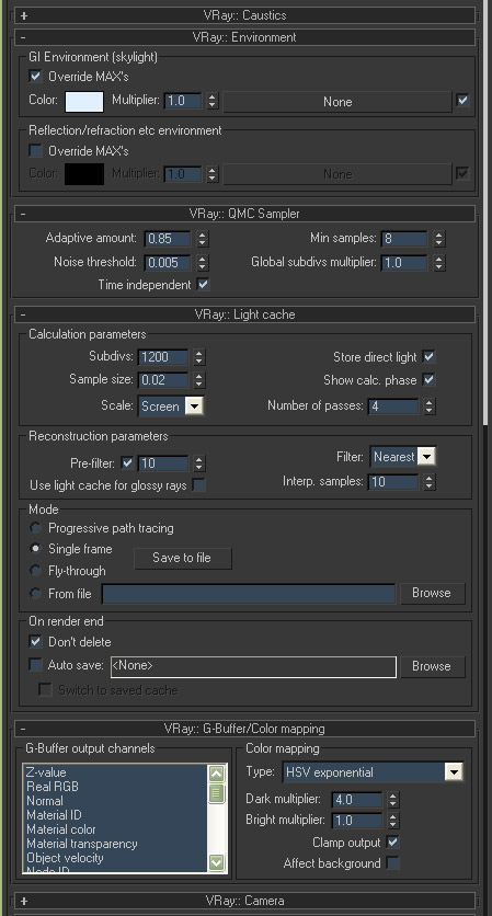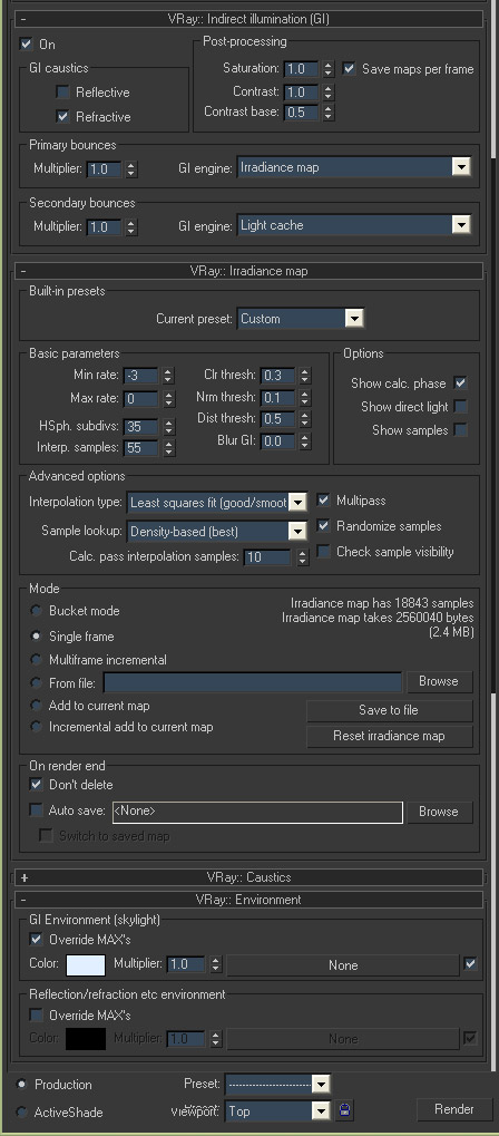 Una última cosa, al tener activado el dont deleete on render end cabe la posibilidad de que esté reutilizando el mapa de irradiancia en los distintos renders que hagas. Asegúrate de borrarlo (el mapa de irradiancia), antes de hacer el render, si has cambiado parámetros. Suerte, un saludo.