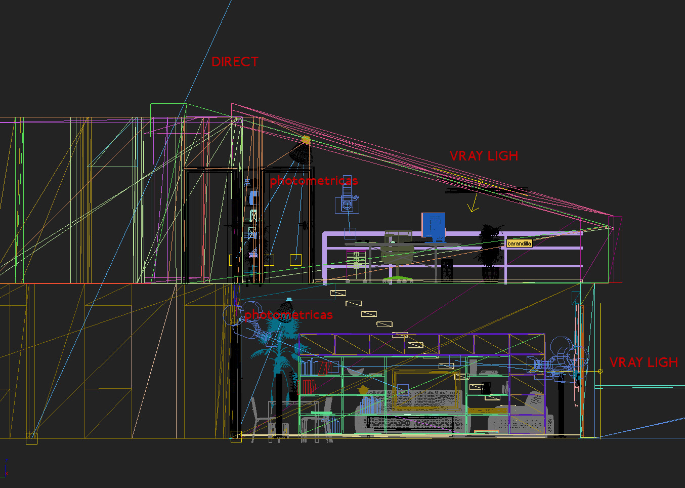 Bueno pues quería plantear un problema que me trae un poco loco, la escena es un interior iluminado con una direct, y 3 Vray light y algunas luces fotométricas con un archivo IES, y creyendo que el problema podría venir de las fotométricas renderice también la escena con las fotométricas apagadas, pero el problema no se va, de todas formas, os dejo el wire para que veáis la ubicación de las luces, en la imagen hay señalada con un círculo la zona en la que veo el error, y es que no hay definición en las esquinas y el efecto es que parece que están separadas o algo raro, entonces a ver si alguien tuviera conocimiento del problema, aunque estado leyendo uno de los temas fijos del foro de iluimnación bueno no he conseguido solucionarlo, un saludo y gracias de antemano.