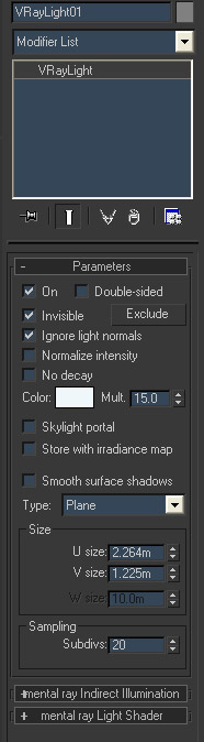 Otra cosa que yo haría seria activar la casilla del comprobar la visibilidad de las muestras (chek sample visibility), por si esta tomando muestras en la parte que no se ve del muro. También modificaría los valores del hsph subdivisiones y los interpolation samples de los basic paramiters, básicamente los invertiría, lo que tienes ahora es un poco como decir: no lo hagas con mucha calidad (HSPS subdivisiones) y para que no se note lo amborronas de pm (interpolation samples). Yo prefiero mejorar la calidad del muestreo. Otra cosa que puede estar equivocada si trabajas con unidades reales (supongo que, lo haces así, pues trabajas con ficheros IES), es el tamaño que has puesto en la Vray shadow de las luces IES, dejar esos valores es decirle al Vray que calcule las sombras de área como si el emisor del luz fuese un cubo de 1 metro de lado.
