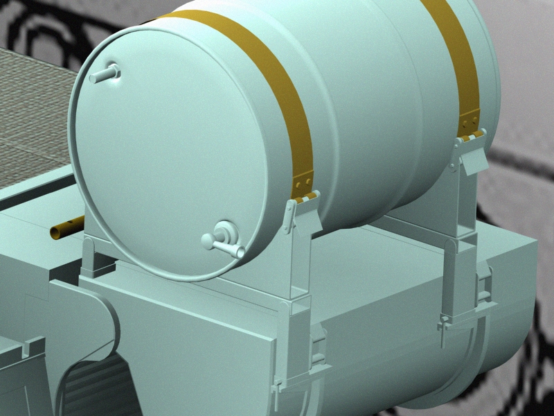Y ahora a manchas con bitmaps, el otro era un color base normal. Ahora a texturizar lo demás aparte, los bidones, el cañón (al que le he hecho una red), cables, herramientas etc.