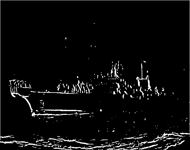 Bueno, para que creas, tomas no me comí mucho la cabeza, es el primer resultado de un filtro de prewitt, sin más. La resolución es pequeña, porque está sacado del video. Aun así, se intuyen las dos líneas, de la cubierta y de la línea del mar, ¿no?