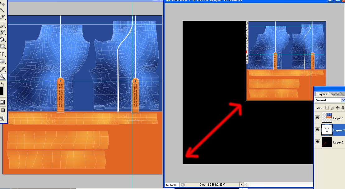 Por ejemplo, en la imagen adjunta, imaginaros que la primera pantalla pertenece a mi programa de edición de imagen preferido, donde tengo la textura adaptada a los UVS. Y la sgunda pantalla es mi editor de UVS, donde y escalos UVS a un cuarto de lo que tendrían que ocupar, y la textura de abajo automáticamente se adapta a esta nueva forma.