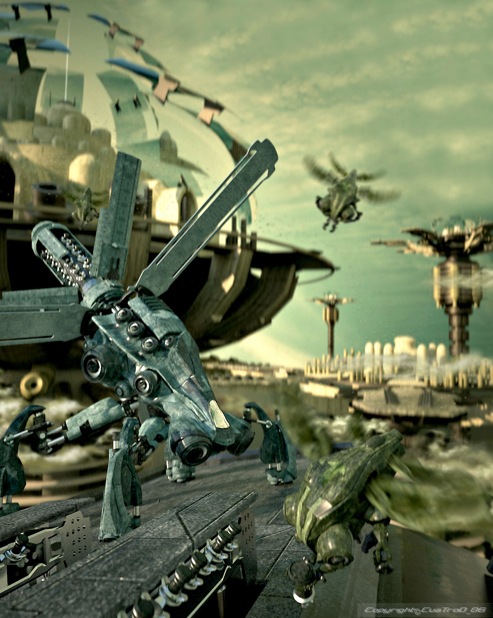 Brutales los diseños de los artilugios metálicos, podrías probar una textura más trabajada, ya que pierden un poco con las que has puesto.