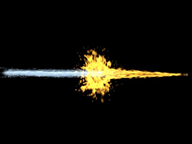 El fuego es un simple sistema de partículas, que emite varias al colisionar. Tiene metaballs copiadas en cada una y un Shader de rayos-x, también con Motion Blur.