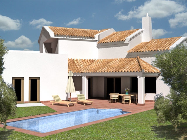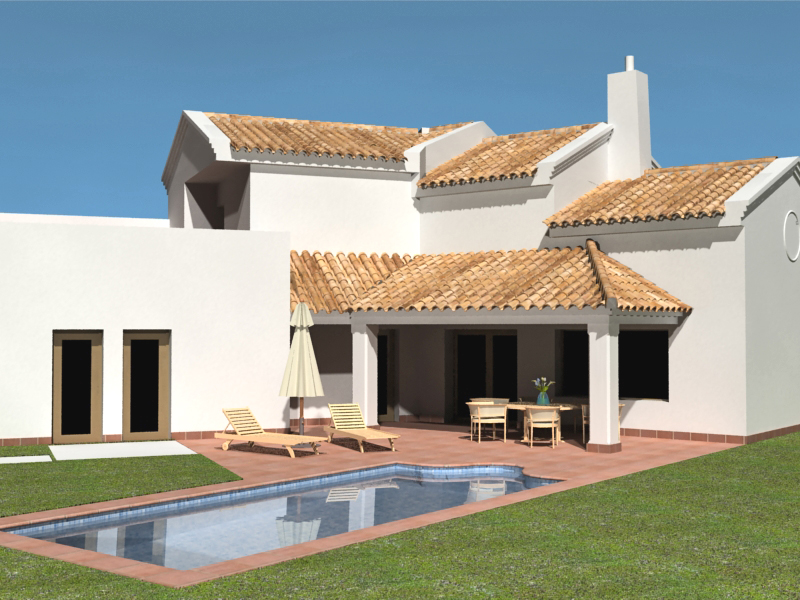 De la casa ni te comento tío, las cenefas esas no existían, se las puse después por deseo del dueño, el porche tampoco era así, la piscina tampoco y las paredes son así de vacías, pocas ventanas o casi ninguna tanto por este lado como por el posterior.