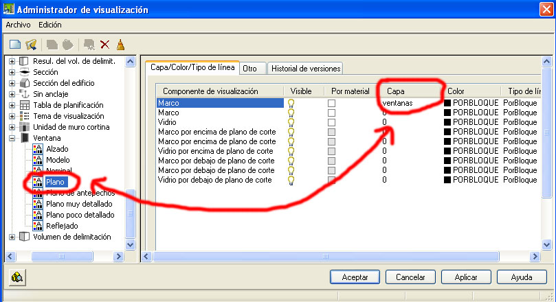 Es porque la capa que queremos borrar esta asignada en alguna representación de visualización. Por ejemplo, la capa ventanas de la imagen adjunta no se puede borrar porque la representación de visualización plano (correspondiente al AEC ventana) está haciendo referencia a dicha capa.