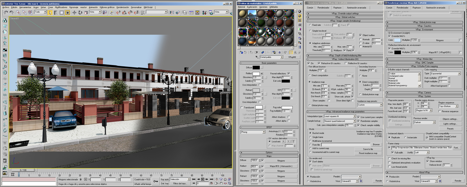 Hola estoy haciendo estos chalet adosados, fijaros en los gristales de la planta alta no se ven las cortinas en cambio en la baja sí, de todas formas, no consigo que reflejen lo que tienen delante a pesar de que lo tengo al máximo en esta ocasión utilice HDRI para la refracción y ni con esas.