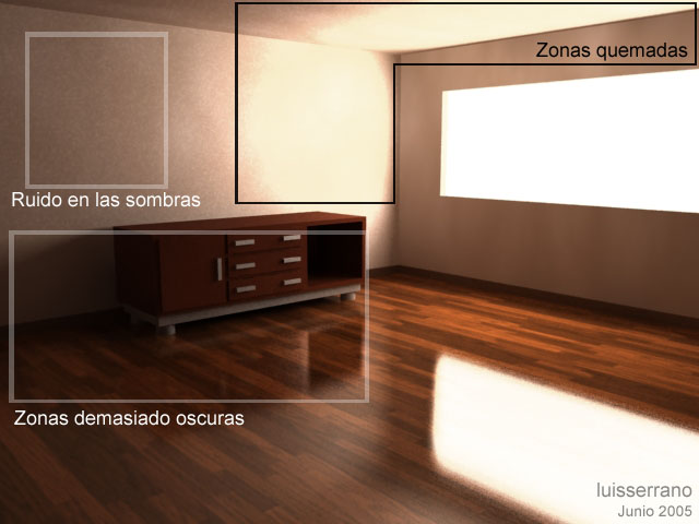 En archivos adjuntos tenéis el wip, comprimido en (*.rar). Mi versión de Vray es la 1.46.10. También, el render original y una copia analizada para destacar los problemas donde quisiera recibir ayuda. Por cierto, la pared lleva una textura con degradados que podría crear confusión a la hora de estimar la calidad del render. En el archivo (*.rar), también podréis encontrar el bitmap para la madera del suelo. Gracias adelantadas y un saludo.