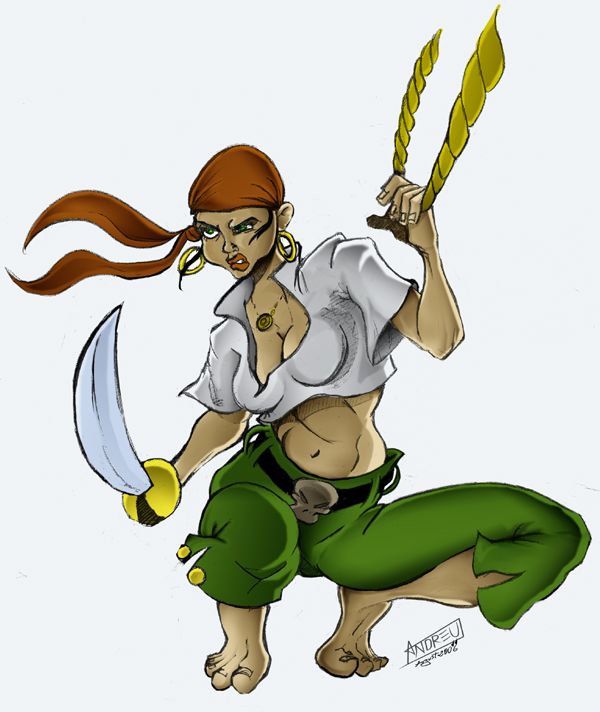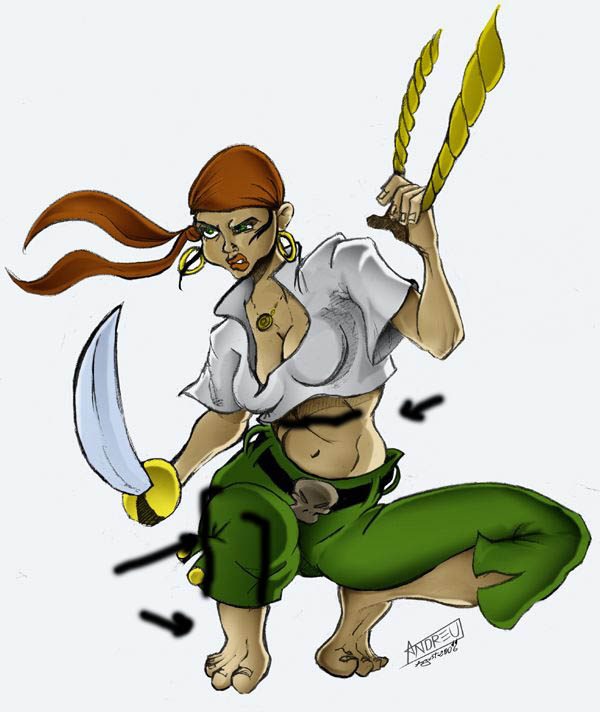 No es que vaya a ser un gran dibujo ni pretendo que sea una gran ilustración. No sé si darle un poco más de caña según lo que me despellejéis por aquí o dejarlo como esta, porque total, castañeta es. Pero en fin. Rajad, rajad cómodamente de mi piratilla sexy. Ya han rajado de ella en otros mensajes y con razón. A ver qué me rajais por aquí damas y caballeros. Y si de todo eso sacamos algo de provecho.