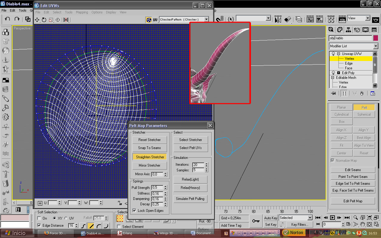 Estoy tratando de mapear un cuerno cacho o cómo lo quieran llamar de este diablo con el Pelt mapping de 3ds Max he seguido el mini tutorial que hace YeraY en el hilo de David Jones y no consigo que el mapeado sea rectangular, en vez de eso queda lo que se ve en la imagen, ¿Qué puedo estar haciendo mal? Gracias de antemano.