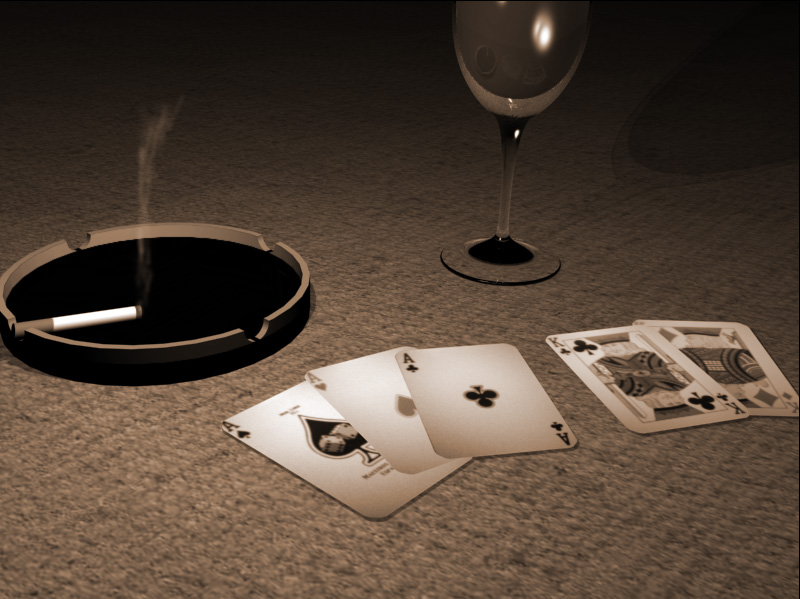 Y a la iluminación le veo algo raro, la copa tiene una sombra muy larga, señal que la luz esta baja, pero el cenicero tiene una sombra muy corta, señal que la luz esta alta, también es cierto que la luz podría estar justo encima del cenicero, no sé, la veo un poco rara.