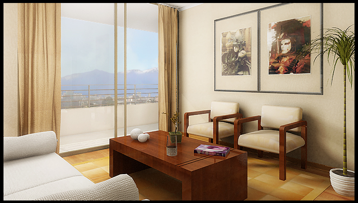 Hola. Lo malo de no poner rebotes secundarios es que la luz no llega a esos recovecos en los que es necesaria, como ser la parte superior de la estantería, y si la iluminación no es natural es muy raro que no se vean los focos de luz, los omnis generan una luz difusa, no muestran sombras marcadas, eso es porque hay 3 de ellos y seguramente hiciste que alguno no emitiera sombras, bueno eso la hace ver muy rara a la imagen, más, allá de los retoques en Adobe Photoshop que ha sido sometida (si es que los hay) lo que creo es que, si la iluminación es difusa viene tiene que tener un foco definido de manera tal que las sombras sean coherentes, por otro lado, la veo un poquin saturada a la imagen, el modelado me parece muy bueno y los materiales bien logrados, coincido con ponerle más Bump al piso, eso puede ayudarte también y otra cosa que me quedo: la mesita del medio tiene un vidrio encima? Porque sino es así la única manera de lograr ese efecto en la base seria dándole un barnizado y alizado, y debería reflejar igual en las patas, para mí sería más real darle un poco de Glossy al reflejo del material.