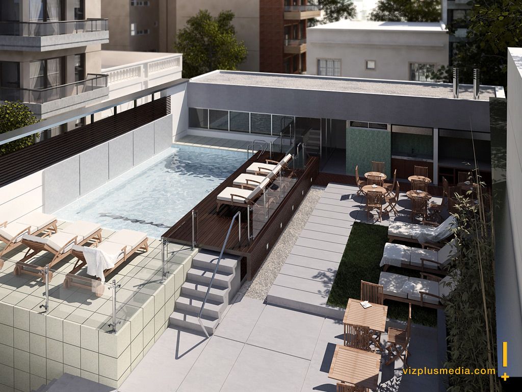 A mí me gusta muchísimo la escena, me encantaría tener una piscina así, bueno, como detalles, me llaman la atención los árboles del fondo y las chimeneas que tienen demasiado reflejo. Un trabajo muy bueno, sí señor.