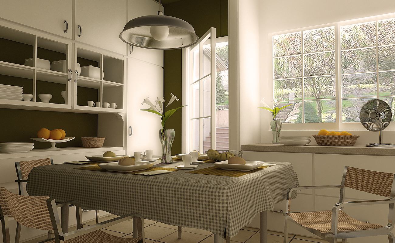 El aspecto general es muy bueno, muy limpio y elegante. Lo más extraño es lo de los cristales de la alhacena y el material de mimbre de las sillas. Por cierto, te puedes descargar un estupendo material de mimbre de: http://www.vray-materials.de/. Un saludo.