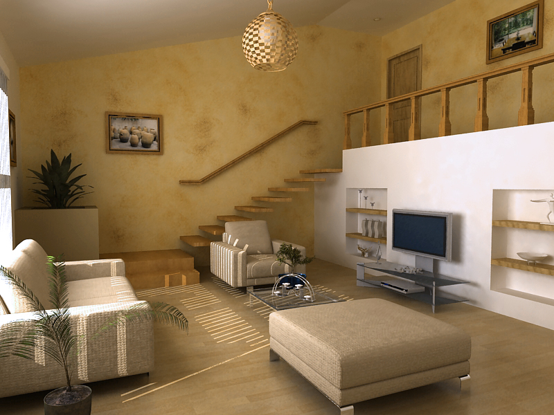 Que buena la textura amarillita de la pared, el render lo encuentro bien, lo que si pondría más baluastradas a la baranda esa que tienes arriba, ganaría algo más la escena.
