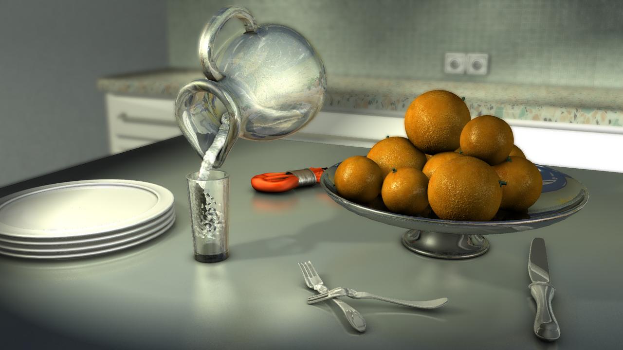 Pues eso, un bodegón con XSI. La iluminación es convencional, con lo de las transparencias el raytracking se podría poner muy heavy para sacar vídeo. Saludos.