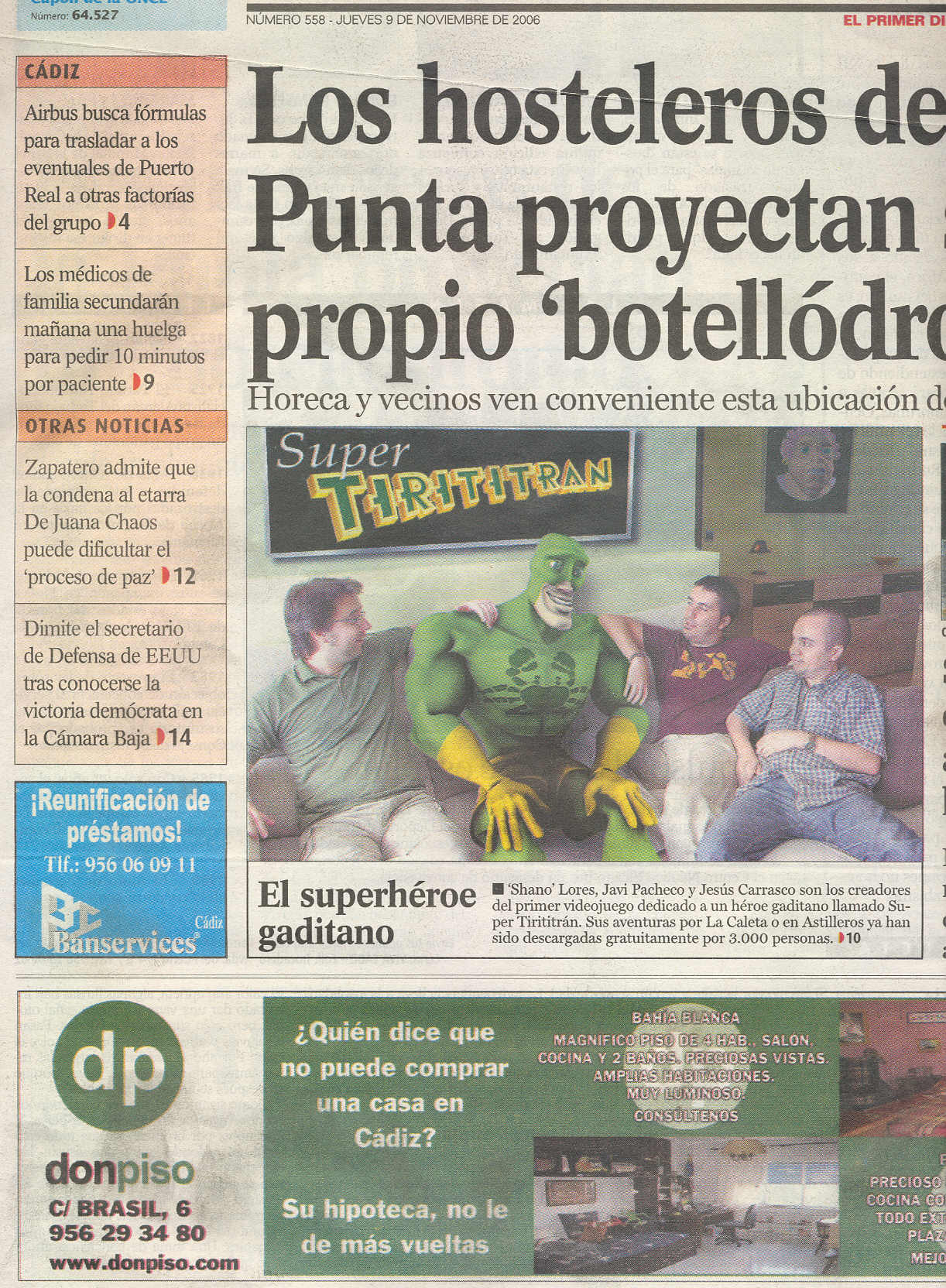Buenas a todos. En los últimos tiempos he estado desarrollando con dos compañeros un videojuego amateur 2d al más puro estilo de los matamarcianos clásicos de máquinas recreativas. Se trata de super-tirititran, el superhéroe gaditano.