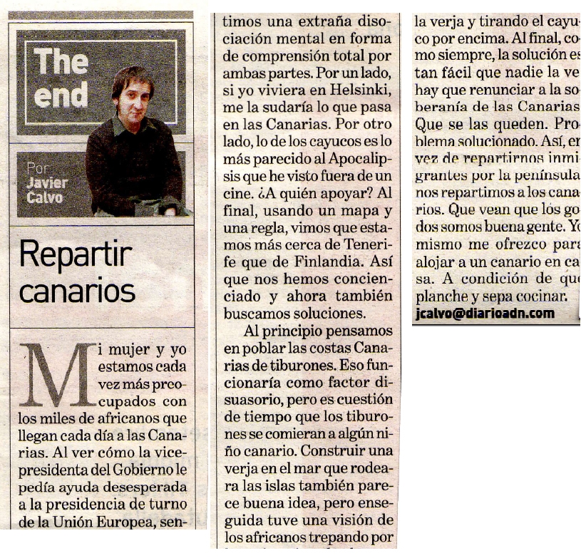 sobre el artículo publicado por Javier calvo, me parece una falta de respeto abordar, en tono irónico, el tema de la inmigración. Como canario, sufro cada día la tragedia en nuestras costas en forma de cayucos. .