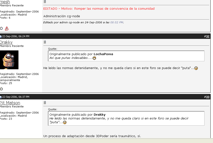 Después de lo de CG node, que no puedo resistirlo. Voy a soltar una palabrota. Puta. Pedo. Pis. Vaya, que a gusto. Para ellos ese foro moderado como un convento de ursulinas.