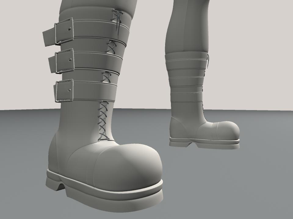 Bien, la segunda son los zapatos: la puntas de los pies son muy abultadas, son ya como un zapato de payaso, sin ofender aclaro. Deberías hacerlas con unas puntas de bota como las que publico aquí: (sin triple w, pues aún no tengo el nivel necesario) triple w.wide-Calf-bots.com/images/985-284876-d.jpg.