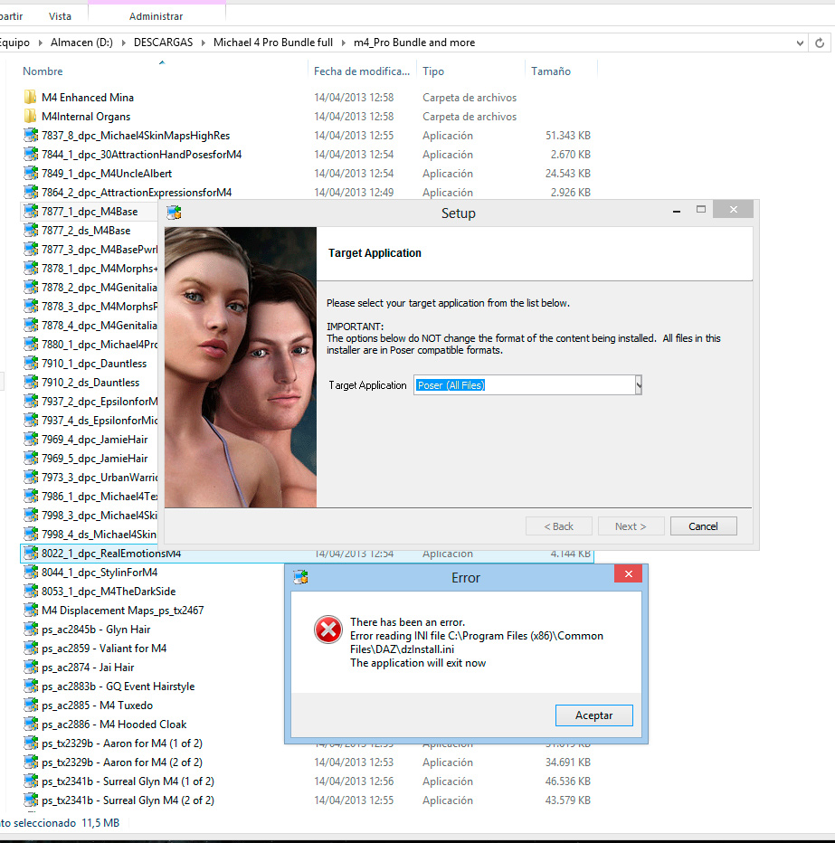 Hola soy nuevo en el foro, estoy empezando con Poser y soy muy novato con este programa, ando un poco desesperado porque necesito instalar este personaje Michael 4 en Poser pro 2012 y no me deja, me da este error. Tengo Windows 8 pro 64 bits y he instalado Poser pro 2012 64 bits, aunque también se instaló el de 32, no sé si habrá algún problema de compatibilidades, ya no sé qué puede ser. Alguien me puedo explicar cómo carajo instalar estos personajes en el Poser, he mirado en varios sitios ya y nada.