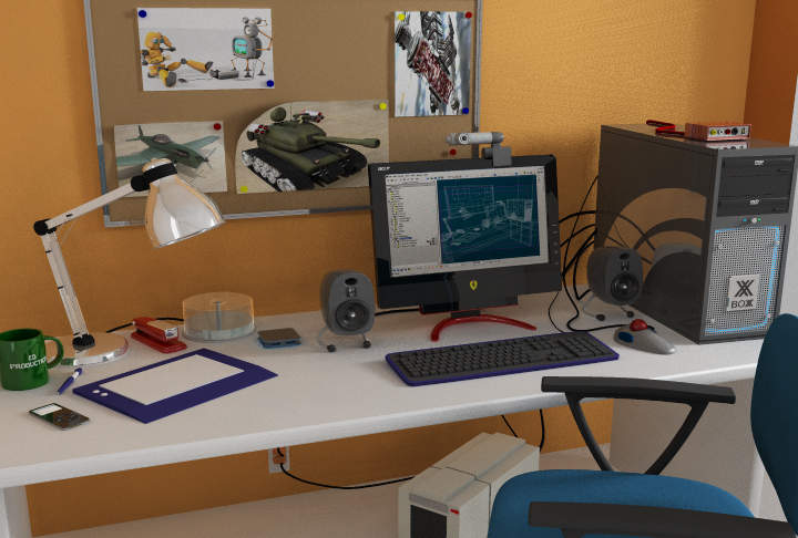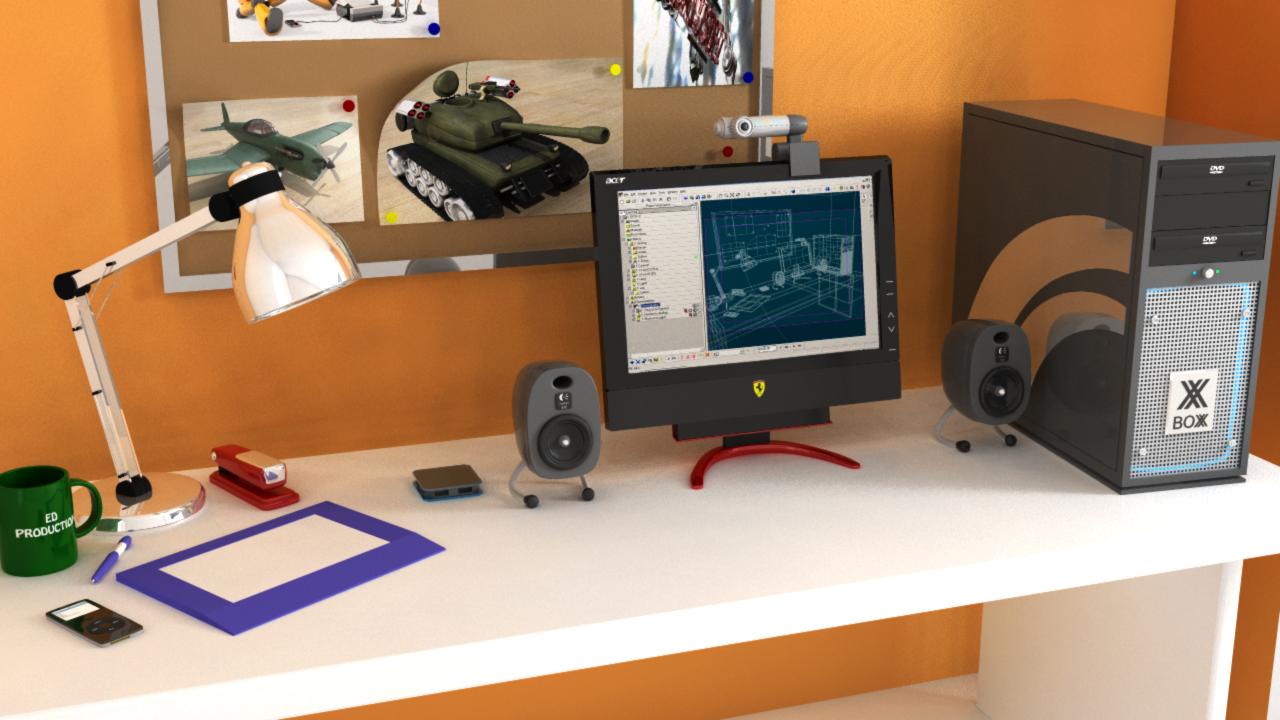 Me sorprende gratamente ver este tipo de trabajos con A:M, no es usual y menos en este foro. Si ya has biselado los filos de la mesa y la torre del PC deberías hacerlo notar más, los bordes afilados restan realismo a los modelos.