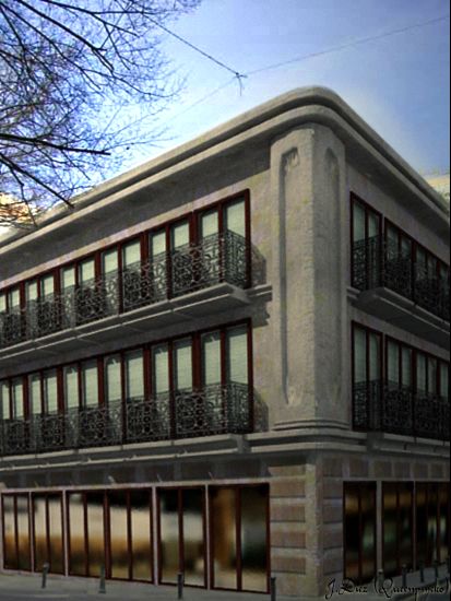 Para empezar la textura de piedra del edificio me parece desproporcionada. Demasiado grande, por las erosiones que tiene. El reflejo de los cristales inferiores está demasiado desenfocado. A mí me parece que los cristales, en una toma así, reflejan las cosas mucho más nítidas.