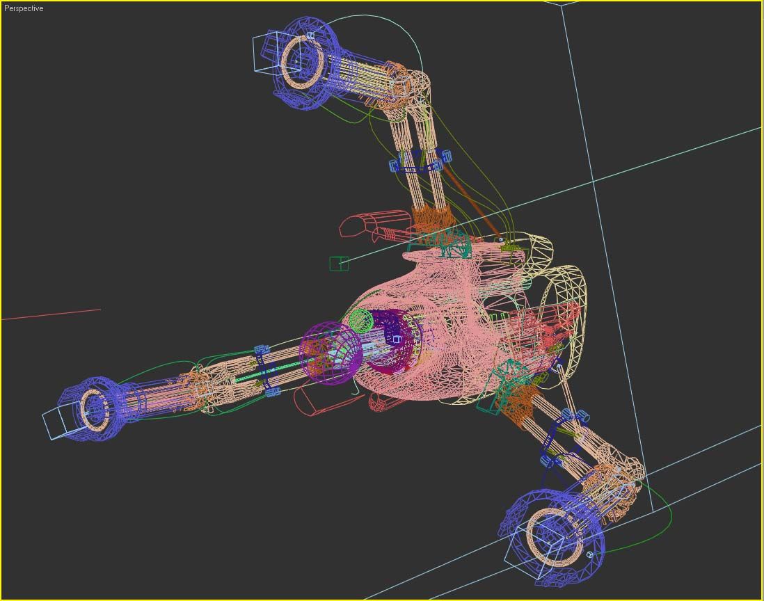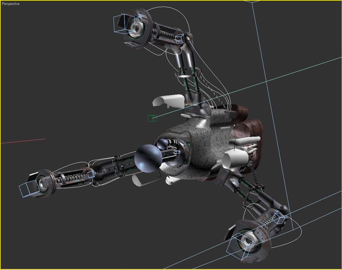 Capturas con el movimiento de los brazos. Y el modo alámbrico. Se modelé todo a base de primitivas y editmesh. Y algún que otro solevado y booleanas. Los cables son solevados que siguen una Spline con Xformar Vinc, así que, se estiran.