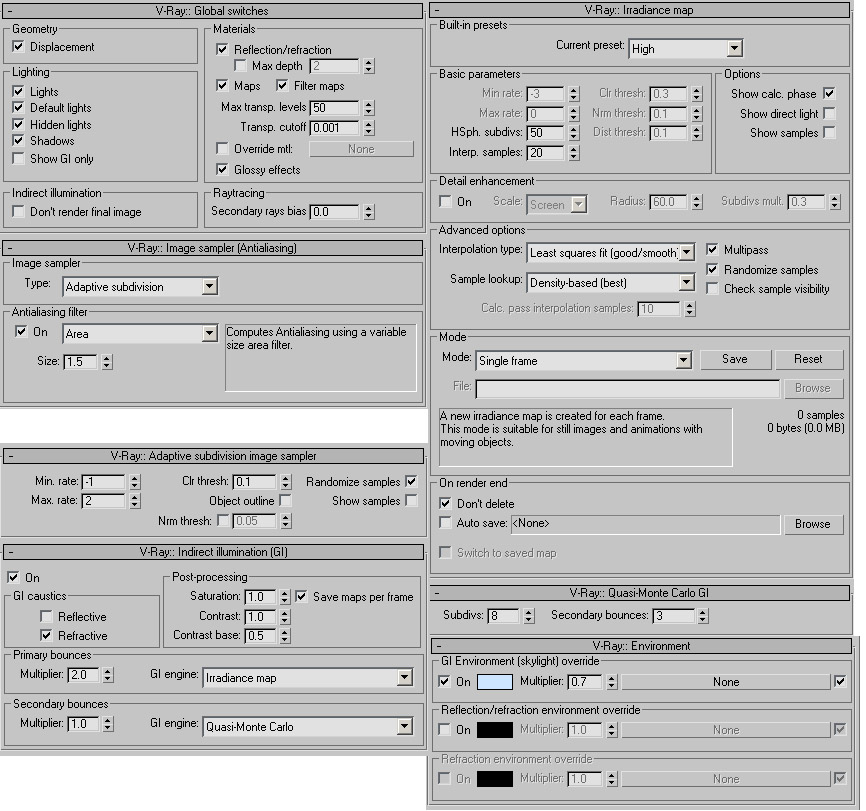 Por los marametros que vi hay algunas cosas que parece que estuvieras iluminando un exterior: Desactiva el default lights, en antialisado cámbialo, es mejor el Catmull Rom que se utiliza mucho en arquitectura, y aunque tarde más cambia ya a light map. Empieza colocando los preset en Low o medium y ponlo en exponential. Con un direct solo es suficiente. Espero haber ayudado. Saludos.