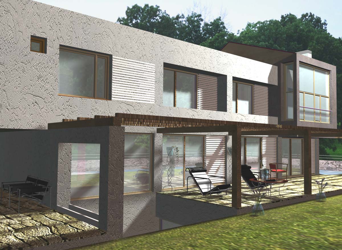 Bueno, en lo referente al modelado deberías biselar todos los cantos, pero bueno, en general está bien, a pesar de que todo el juego de materiales-texturas e iluminación lo destrozan. Para empezar el material del edificio (la fachada), no da la sensación de piedra, a mi parecer refleja como si fuera un material plasticoso, y lo mismo con el material que has usado en las baldosas del porche, etc. En los tablones de madera que cubren el porche la textura está mal aplicada (no indicas con qué software has trabajado, pero supongo que, es 3d Studio Max, así que, aplica un modificador UVW mapping box). El césped no sabría que fuera césped de no ser por el color verdoso, prueba a meterle un mapa de desplazamiento o modela a mano la hierba. La iluminación es otro tema, pero no solo Vray es capaz de producir imágenes para quitarse el sombrero, todo es cuestión de práctica y conocimientos. Ánimo y dale duro al 3d.