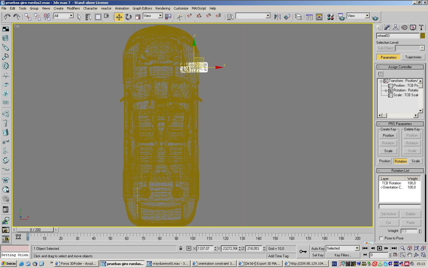 Hombre, viendo la animación de sukp con Reactor es difícil de que mi propuesta quede mejor. Pero bueno sí, es una forma diferente de animar un coche. La forma de aplicar el script es la siguiente. Una vez que tienes aplicado el script a la línea (funciona mejor con líneas Nurb, por cierto) te aparece un dummie y un círculo. Tienes que coger tu coche y vincular al dummie (para que tenga la misma animación). Con las ruedas enlazadas al coche, tienes que darles un orientation constraint, cogiendo de orientation target el whelradius. Ten cuidado que el whelradius tenga el mismo radio que tus ruedas. Si no te giraran mal. Y ya está.