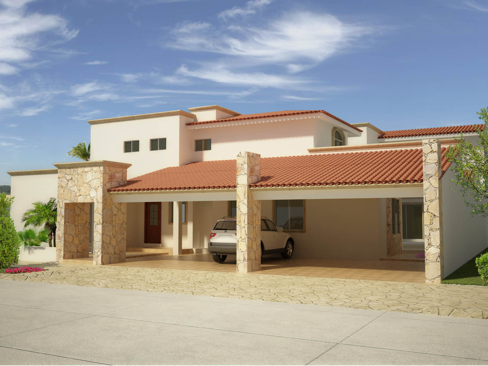 Por otro lado, me parece que es muy brusco el corte entre el piso de piedra y el de hormigón (pero es solo cuestión de diseño) y en cuanto al render me parece ganaría un poco más de realismo si las tejas tuviesen texrturas desparejas, no todas del mismo color, es muy uniforme y monótono y casi nunca se da así en la vida real (a no ser que se pinten después de colocadas).