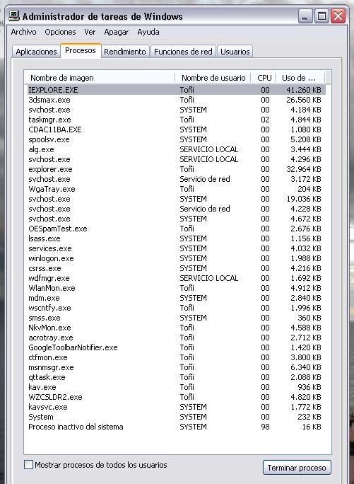Bueno a mi tema, resulta que me baje el (*.ace) utilites y el reg cleaner, pero como no me iba el ordenador pues no lo pasé, y ahora que me va, han expirado los 30 días. Pongo el administrador de tareas por si veis algo que yo no veo y sea importante.