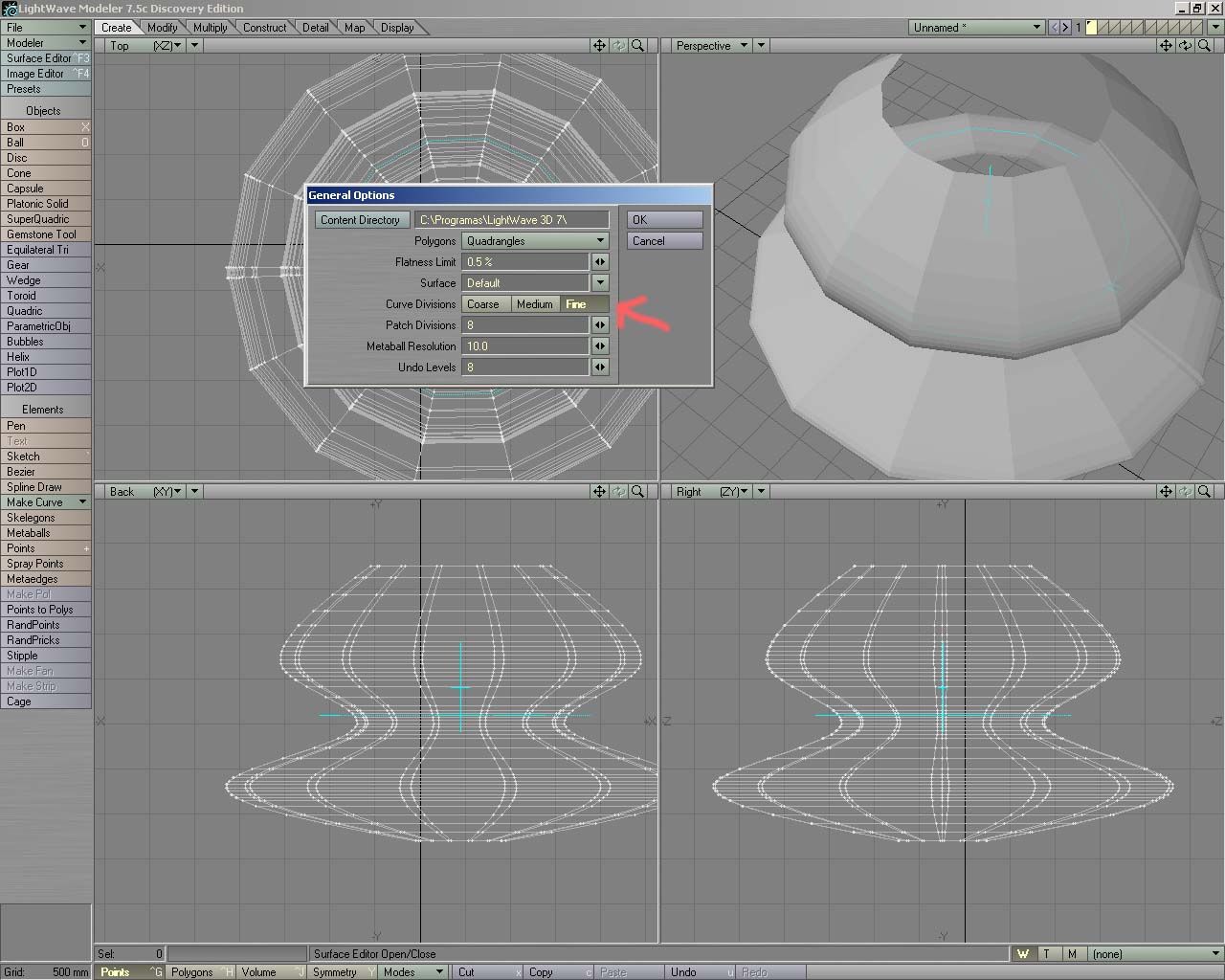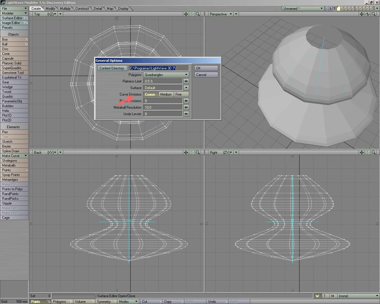 Pues ya está Cabfl te ha dado la respuesta estupendamente. En general options vigilar el curve divisiones y con el atajo (n) para sacar panel numérico y la herramienta activa a jugar. Lástima que LightWave no incorpore un sistema de curvas como el de 3ds Max que es mi preferido esperemos que el 8.